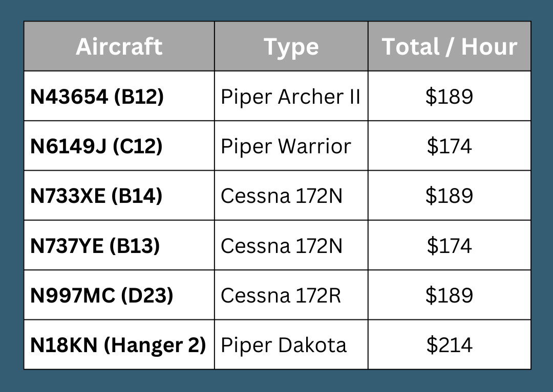 Aircraft usage is by the hour (wet) with rates varying by aircraft, and are reserved through our scheduling software.